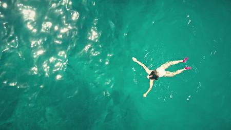 Aerial top down view of a beautiful young woman swimming in the sea