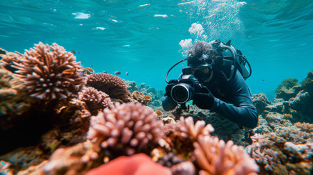 Marine engineer researching coral reef biodiversity and health with underwater tools AI generated