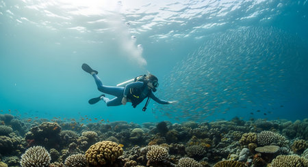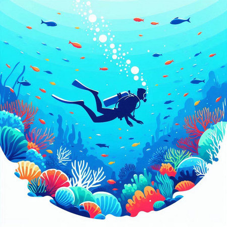 An AI generated illustration of a diver exploring the vivid coral reef teeming with marine life in crystal waters