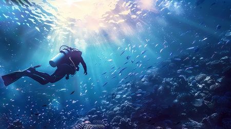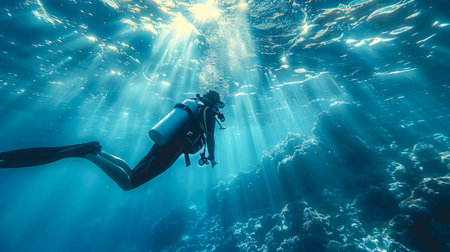 A scuba diver swims beneath the oceans surface, exploring the vibrant underwater world illuminated by rays of sunlight. The scene captures adventure, nature, and the thrill of diving.