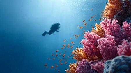 Scuba diver explores a colorful coral reef teeming with marine life. Bright orange fish swim among the vibrant pink corals, showcasing the beauty of underwater ecosystems