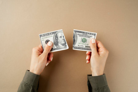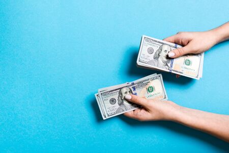 Female hand giving one hundred dollar banknotes on colorful background. Top view of wealth concept with empty space for your design.