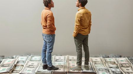 Two men stand on a large stack of dollar bills, representing financial growth, success, and contemplation.