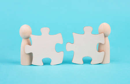 Man and woman hands joining two puzzle pieces. Partnership, connection concept. Mutual understanding, support in relations. High quality photo