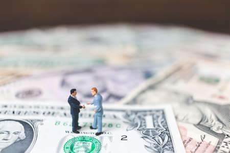 sharing dollars between two businessman for pay goods in medical gloves, isolated on white background. pandemic period