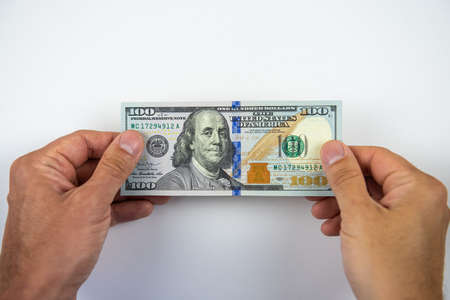 a man counts hundred dollar bills by stacking them on the table. High quality photo