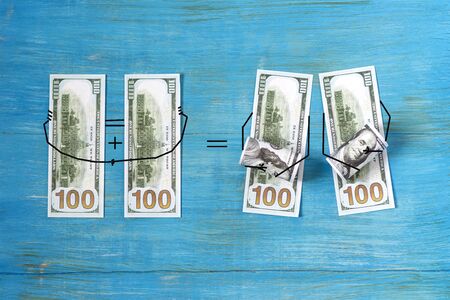 Money gives rise to money. On a blue wooden background, dollar bills. Signs