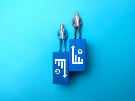 Miniature people and wooden block with business graf icon. The concept of business decline and increase