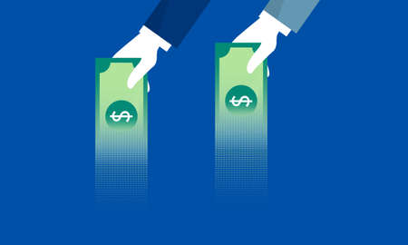 Disappearing money,hand holding dollar bills,blue background,vector illustration