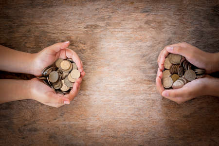 Coins in two hands show saving money concept keep money for the future, education on wood background.