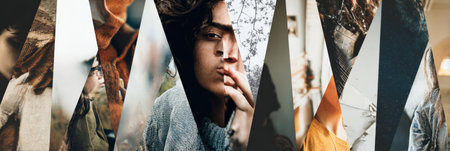 A creative collage highlights various expressive portraits, each displaying unique emotions and activities. The artwork emphasizes individuality and artistry.