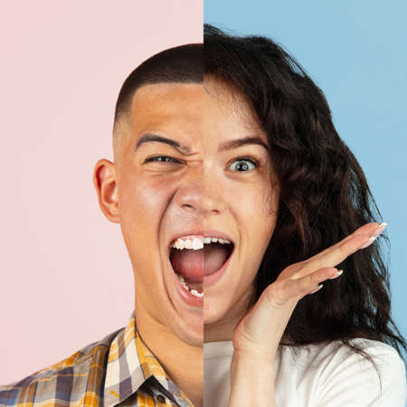 Two halves of young people faces, man and woman over colored backgrounds. Creative collage.