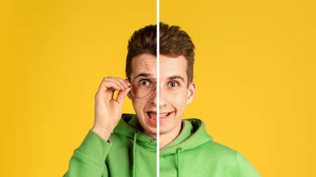 A man with glasses before and after. On one half, the face is happy without glasses, and on the other, a sad expression with glasses. Poor vision treatment concept, laser eye surgery, lens replacement