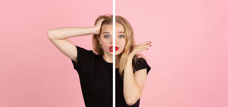Kindly and crazy. Fun and creative combination of portraits of young girl with different emotions, various facial expression on splited studio background. Bipolar personality. Copyspace for ad.