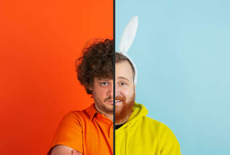 One offended and one contented men. Fun and creative combination of portraits of young people with different emotions, various facial expression on splited multicolored background. Copyspace for ad.
