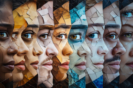 dramatic collage of faces, different races and ethnicities, fostering acceptance and embracing diversity.