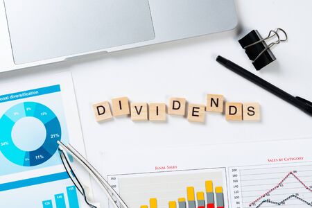 Dividends payment concept with letters on wooden cubes. Still life of office workplace with supplies. Flat lay white surface with laptop computer and financial diagrams. Capital savings and investment