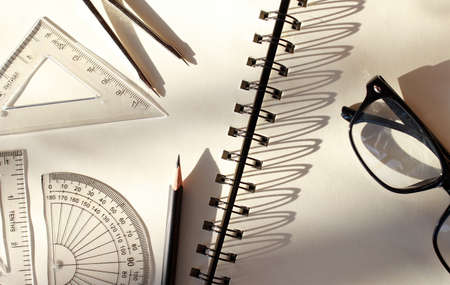 Ruler and compass on white paper with open book in bright sunlight. concept of precise measurement, drawing tools, educational supplies.