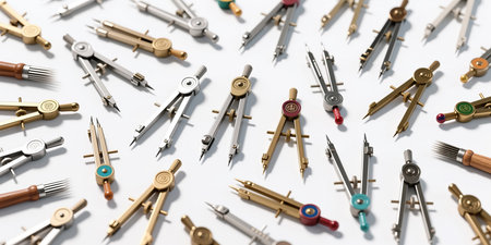 A non-repeating pattern of numerous metallic drawing compasses in various colors and designs on a white background.