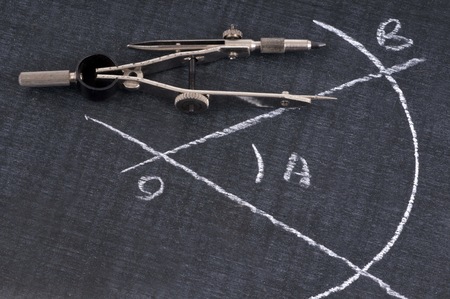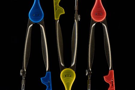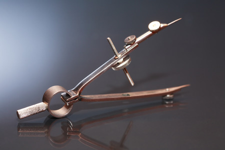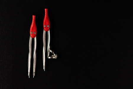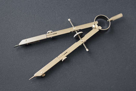 Top close up of geometrical tools - divider and compass shot with black surface in the background