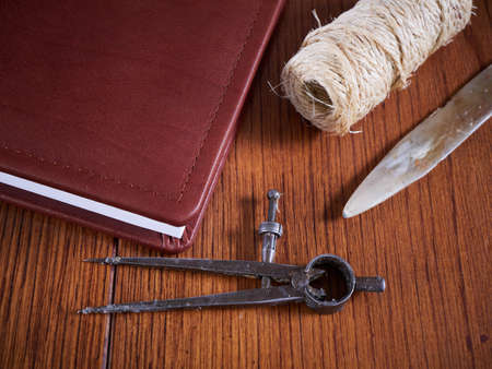 A metal Circinus arranged on a notebook. Accessories for drawing in a design office. Light background.