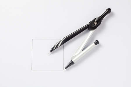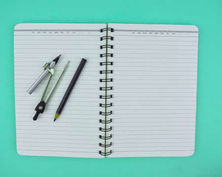 Compass and a black pen on placed top of a open note paper diary isolated on a white background
