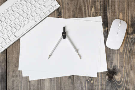 Flat lay of keyboard, pc mouse, compass and paper on wooden surface. Workplace of architect, constructor, designer in top view. Start a new project. Construction and architecture.
