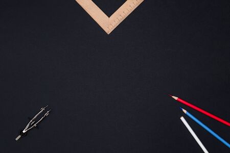 white paper with copy space and compasses, ruler, pencils on black and wooden table