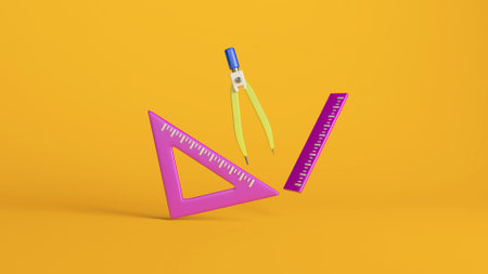 3D render geometry tools including a purple triangle ruler, purple straight ruler, and yellow compass on yellow background.