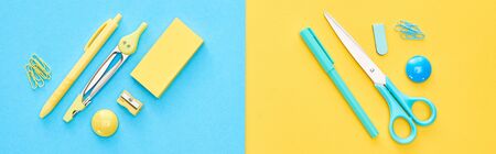 Creative school minimalistic background with yellow supplies: pencil, ruler on cyan background. Flat lay. Mock up