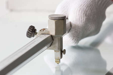 Glass technicians are cutting glass using glass tools according to the customer's order.
