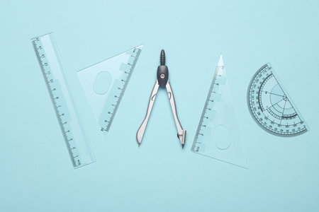top view of paper, smartphone, pencil, pen, ruler and compasses