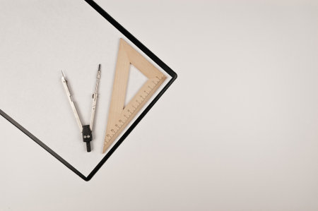 Top view of black clipboard, white blank, triangle ruler and compass on white background. Architecture drawing flat lay, copy space.