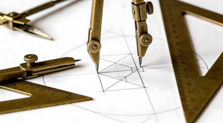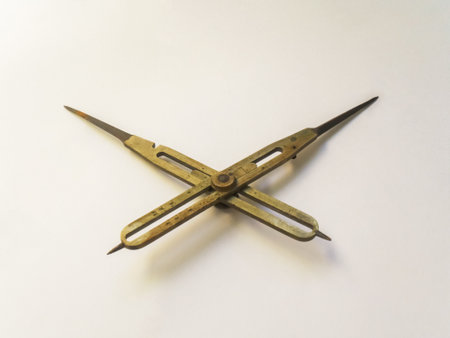 A vertical tall (9:16) still life showcasing antique drafting instruments--compasses (brass and chrom