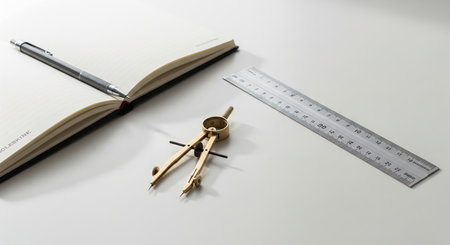 Pen on open notebook with compass and ruler. Essential tools for study, art, drafting, and office work, symbolizing precision and design..