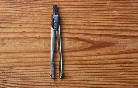 Engineering compass on a wooden surface in top view. Workplace of architect, constructor, designer. Engineering and Design. Construction and architecture.
