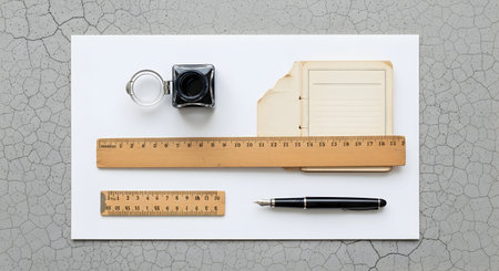 Top view of wooden ruler, pen, notebook and ink bottle on grunge background