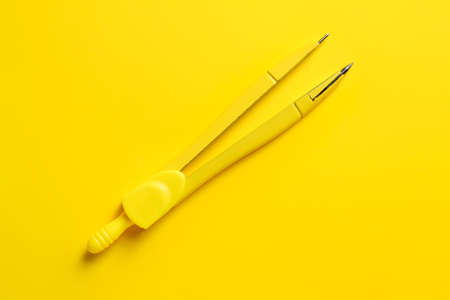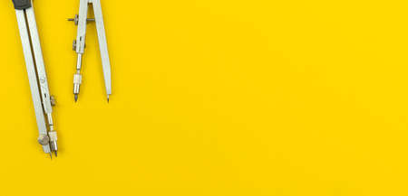 Geometric school instrument and supplies banner background, concept of education, drawing compass on yellow office desk, copy space and top view photo
