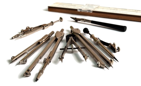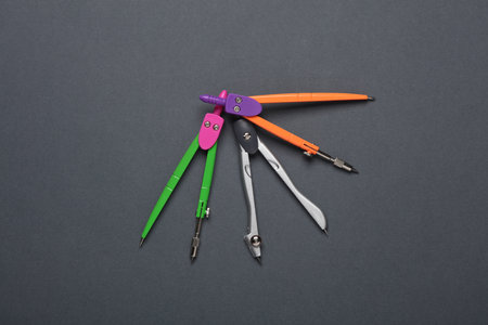 Top close up of geometrical tools - divider and compass shot with black surface in the background