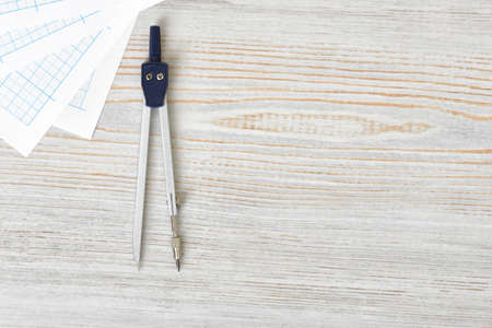 Compass and graph paper in top view with copy space on the right side. Workplace of architect, constructor, designer. Start a new project. Construction and architecture. Tools for drawing.