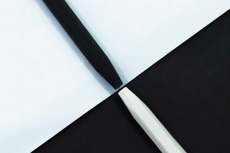 Minimalist close-up of two pens/pencils, black and white, crossing on a diagonal split background. The image emphasizes contrast, balance, and partnership. It suggests writing, business, cooperation, or conflict. Clean, simple design with ample copy space.
