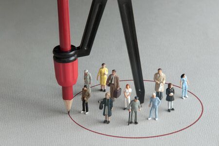 Circle drawn around a group of miniature people with a compass; immunity, vaccination, antibody protection