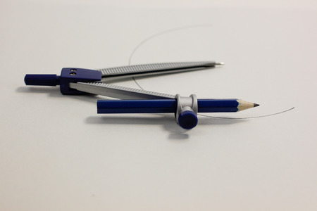 A figure drawn by a compass on white paper. Triangle, circle and compass in space.