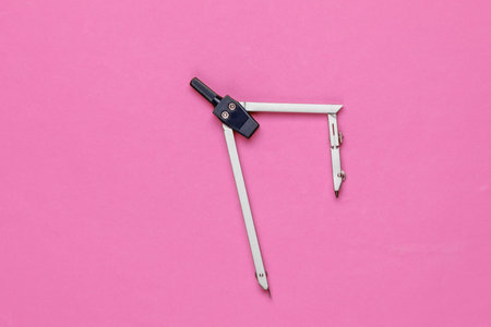 Compass for drawing on pink background. Top view. Stationery. Engineering
