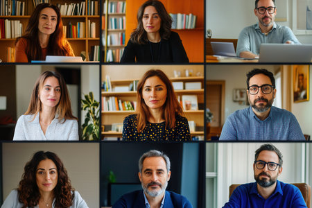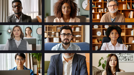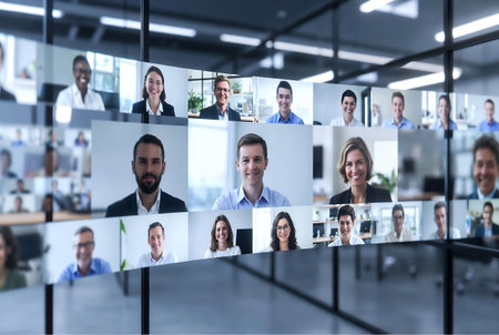 Several professionals take part in a virtual meeting, showing diverse expressions and backgrounds in a bright office atmosphere.