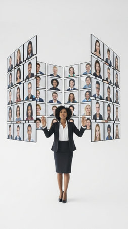 Dynamic full-body vertical concept of a professional leading a high-energy virtual meeting. Diverse colleagues in a synchronized screen grid. Remote work.