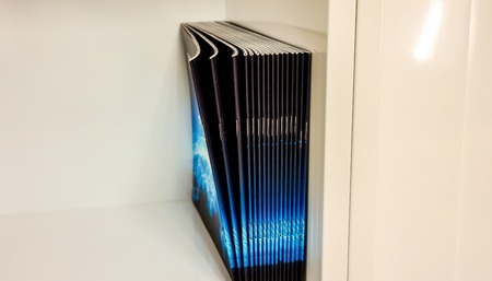 deep blue black thin books with white shits of paper stay strong one by one on white shelf against white wall in office of book store. strong rows of books on shelf closeup