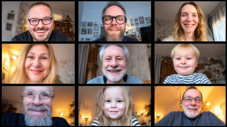 Screen view of a multi-generational family on a group video call. Happy people of different ages connecting online. Concept for remote communication, family bonding, and technology.