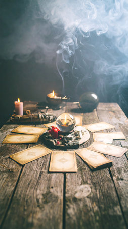 Table prepared for a tarot card reading. Mystery and futurology night.