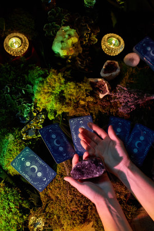 individual holds a crystal while examining tarot cards laid out on a table. Soft candlelight and natural elements create an enchanting atmosphere for divination.